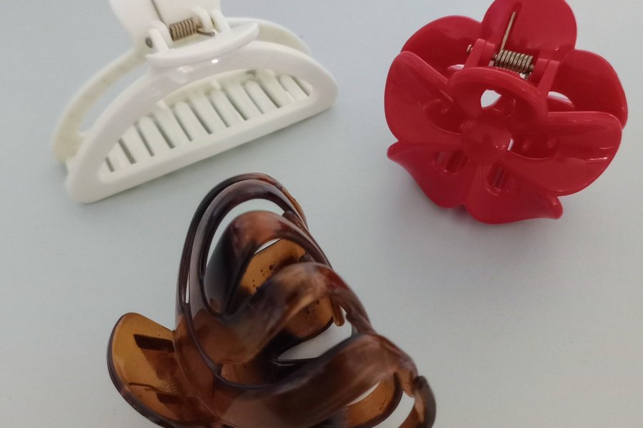 Tre hårklämmor i olika färger och utföranden. En vit, en röd och en brunnelerad (sköldpadd).