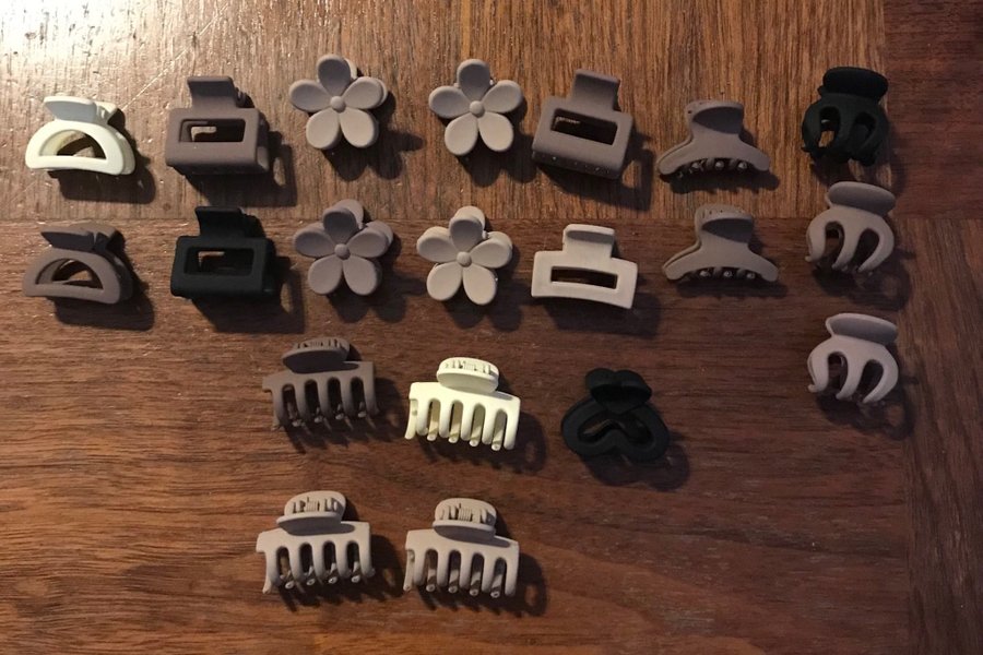 Ny Ett set med 20 hårklämmor i olika färger och former. Innehåller klämmor i svart, beige och grått. Perfekt för att hålla håret på plats.2,5-3 cm