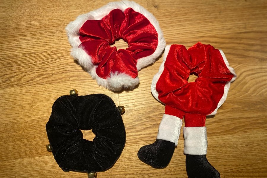 Här är ett set med tre hårscrunchies. En är röd och vit, designad som en tomte. En annan är röd med vit kant, och den sista är svart med små bjällror.
