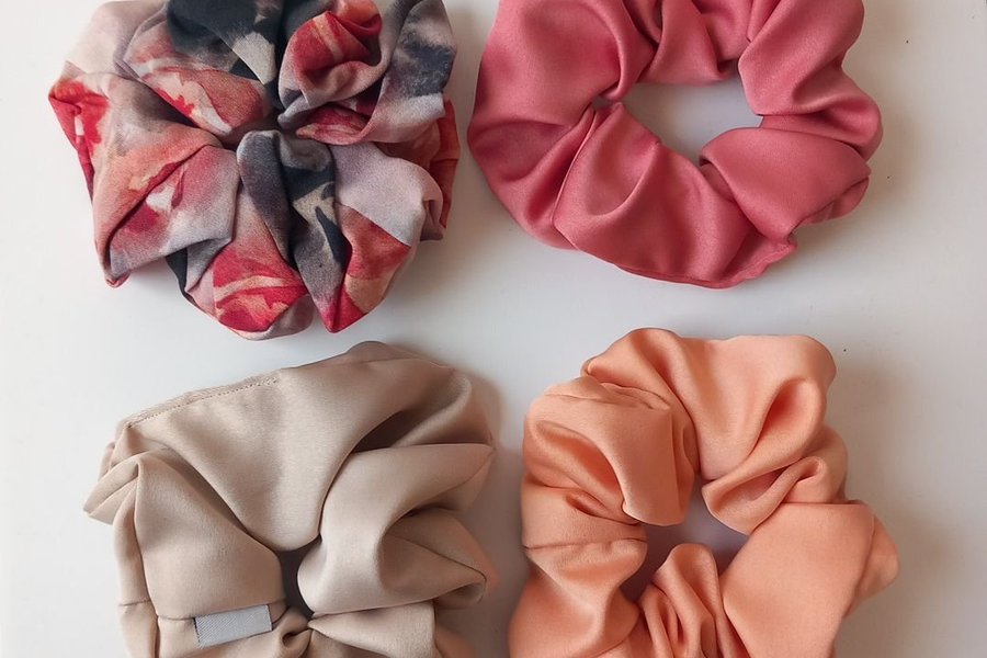 Fyra scrunchies i olika färger och mönster. En scrunchie har ett blommigt mönster i rött, svart och vitt. En annan är enfärgad i en mörkare rosa nyans. En tredje är ljust beige och den fjärde är persikofärgad.
