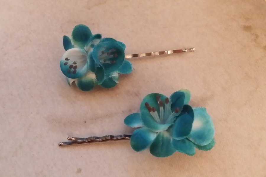 2 blåa tygblommor på hårnålar
