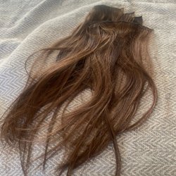 Två hårtofsar i syntetiskt hår. De är i en blandning av blonda och bruna nyanser.