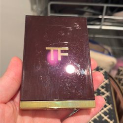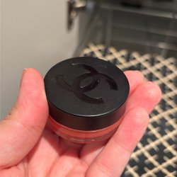 Rouge i en guldfärgad dosa med spegel.