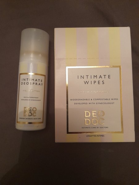DeoDoc intimset med deospray Violet Cotton och intimservetter Fresh Coconut. Mild antiperspirant deospray utvecklad av gynekolog. Biologiskt nedbrytbara och komposterbara intimservetter utvecklade med gynekolog.