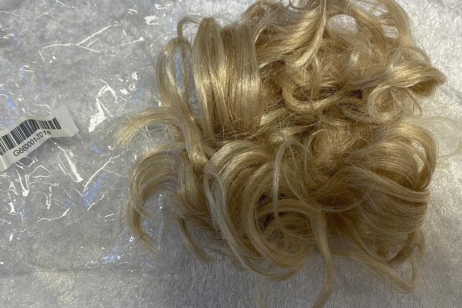 Blond lockig hårförlängning för att skapa volym och fyllighet. Perfekt för speciella tillfällen eller för att variera din vardagslook.