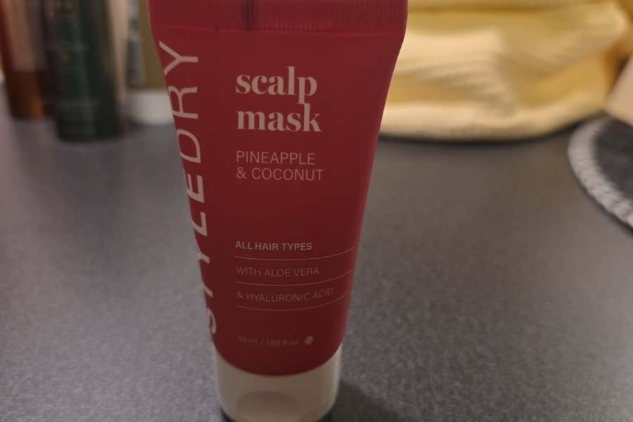 Hårinpackning för hårbotten från Styledry med doft av ananas och kokos. Passar alla hårtyper och innehåller aloe vera och hyaluronsyra. Volym: 50 ml.