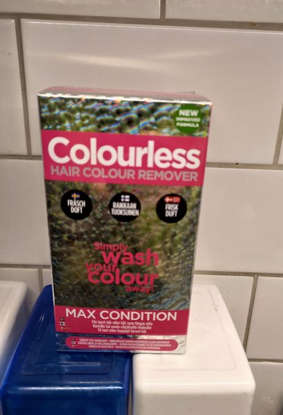 Colourless Max Condition hårfärgsborttagning. Produkt för att ta bort permanent eller semipermanent hårfärg genom tvätt.. Avsedd för användning i hemmet enligt bruksanvisning på förpackningen. Nytt.Köptes nyss och blev över. Kan hämtas också i Odenplan.
