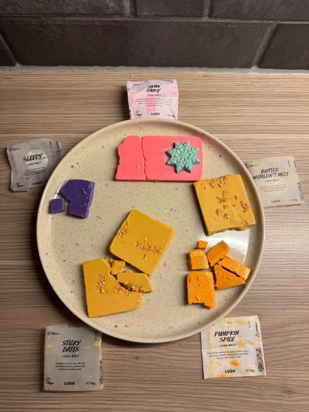 Här är ett urval av Lush Melts: Snow Fairy, Sleepy, Sticky Dates, Pumpkin Spice och Butter Wouldn't Melt. Perfekt för bad eller oljebrännare.