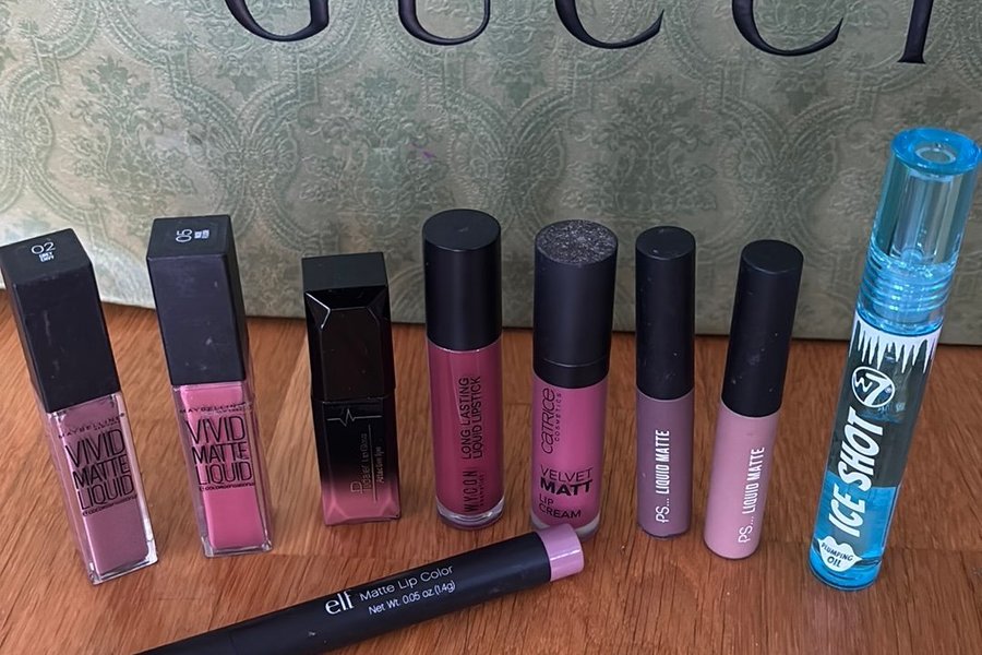 Ett sortiment av läpprodukter inklusive Maybelline Vivid Matte Liquid, Wycon Long Lasting Liquid Lipstick, Catrice Velvet Matt Lip Cream, PS Liquid Matte, Elf Matte Lip Color och W7 Ice Shot Plumping Oil.