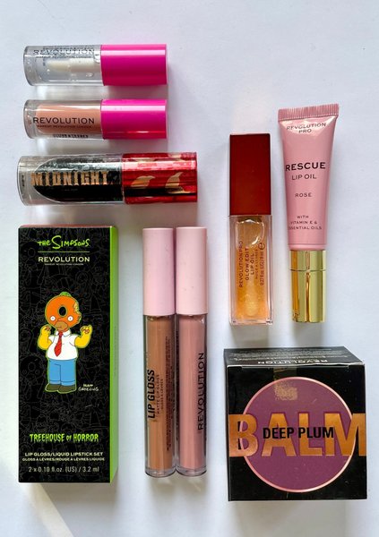 Ett sortiment av diverse läpprodukter från Makeup Revolution. Inkluderar bl.a. Revolution Gloss, Revolution Pro Glow Edit Lip Oil, Revolution Pro Rescue Lip Oil Rose och The Simpsons Treehouse of Horror Lip Gloss/Liquid Lipstick Set.