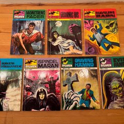 Agent X9 1973, nr 8-9 och 12. Tejpbitar på ett par omslag. Delar av omslagets baksida saknas på ett nummer. Signaturen "MW" stämplad i blått/svart tusch i nedre vänstra hörnet på omslagets insida, ca 1-2 cm hög. Signatur även på sidkanten på ett nummer. Förmånligt porto.