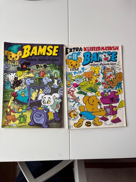 Två Bamse serietidningar från 1989 och 1987. Den ena tidningen är nummer 11 från 1989 och den andra är nummer 11 från 1987 med extra klistermärken.