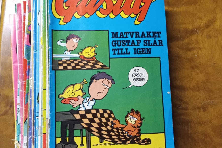 Gustaf serietidning från 1985, nummer 2. Tidningen har texten "MATVRAKET GUSTAF SLÅR TILL IGEN