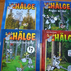Två Hälge böcker av Lars Mortimer. Titlarna är "Hälge slår tillbaka!" och "Mångalna i storskogen".