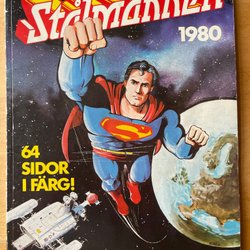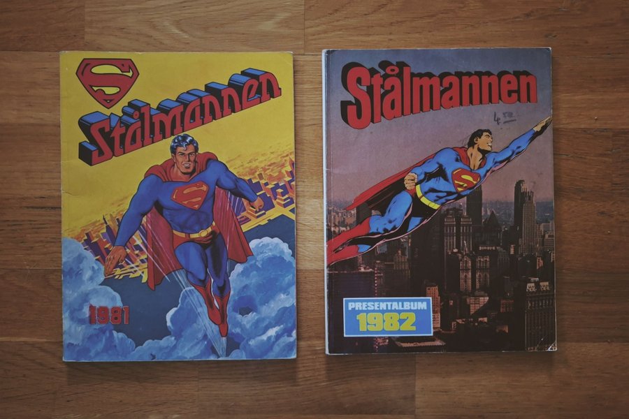 två seriealbum med Stålmannen. en från 1981 & en från 1982. båda nummer har lite färgpenna på sig, ena ett pris i blåfärg och andra har lite rosa vid "1981".