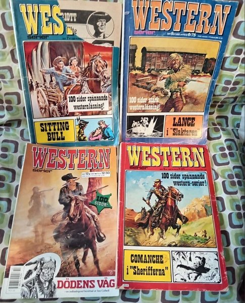 A bundle of Western Serier comics, featuring titles like "Lance i Slaktaren", "Comanche i Sherifferna", "Sitting Bull", and "Dödens Väg". Each comic contains 100 pages of western stories.