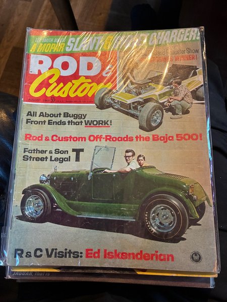Ett exemplar av tidningen Rod & Custom från augusti 1969. Innehåller artiklar om buggy front ends, Baja 500 off-road och ett besök hos Ed Iskenderian.