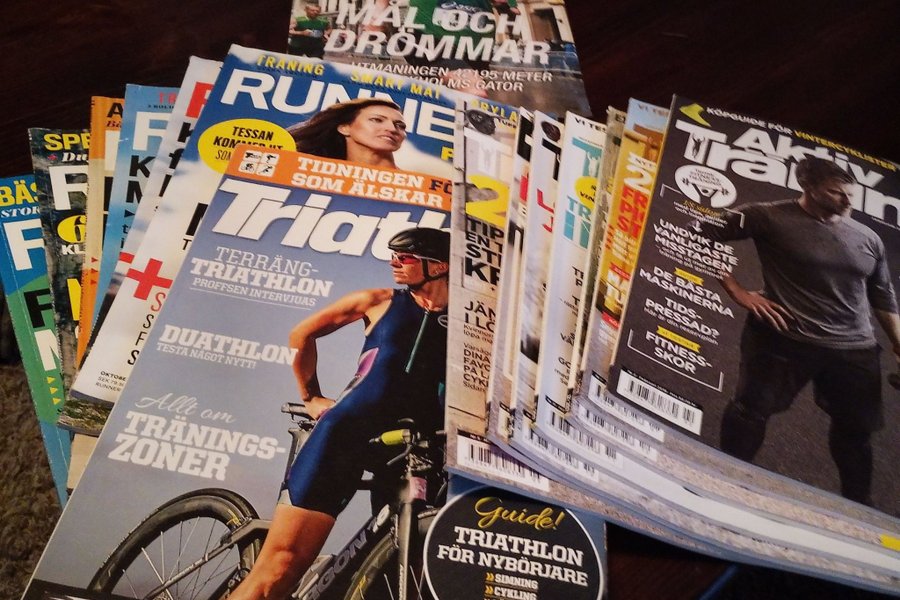 Ett parti med träningstidningar. Innehåller tidningar om löpning, triathlon och aktiv träning. Bland titlarna finns "Runner's World", "Triathlon" och "Aktiv Träning".