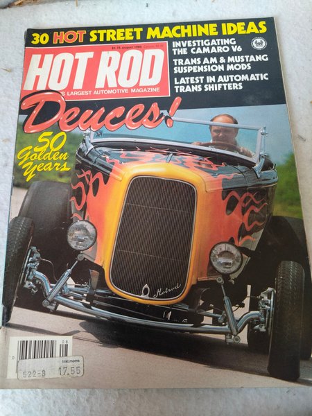 Tidningen Hot Rod från augusti 1982. Innehåller artiklar om 30 heta street machine-idéer, undersökning av Camaro V6, Trans Am & Mustang fjädringsmodifieringar och det senaste inom automatiska växellådor. Framsidan visar en hot rod med flammor och texten "Deuces! 50 Golden Years".kan ev finnas fler ?
