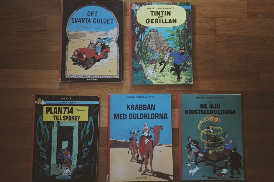fem stycken serier från tintin, samlingen innehåller titlar som;