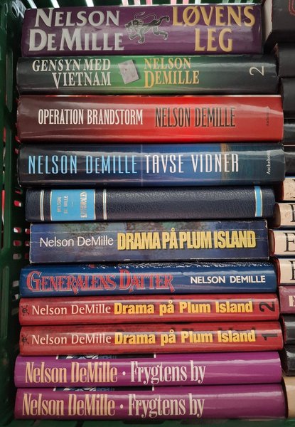 En samling af Nelson DeMilles bøger. Inkluderer titler som 'Løvens Leg', 'Gensyn med Vietnam', 'Operation Brandstorm', 'Tavse Vidner', 'Katedralen', 'Drama på Plum Island', 'Generalens Datter' og 'Frygtens By'. Perfekt til Nelson DeMille-fans.