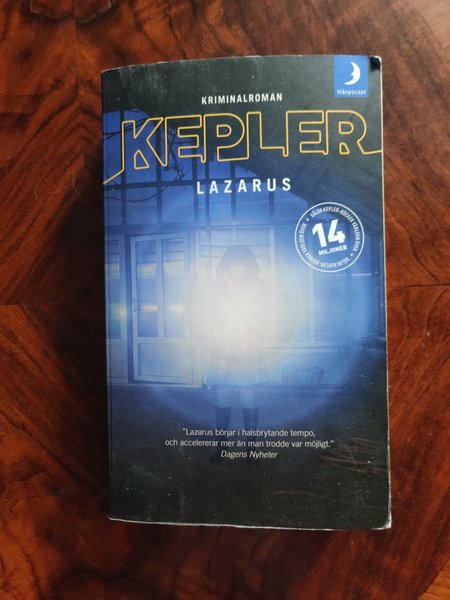 Kriminalromanen "Lazarus" av Kepler. Boken har sålt över 14 miljoner exemplar världen över. Enligt Dagens Nyheter "börjar i halsbrytande tempo, och accelererar mer än man trodde var möjligt."