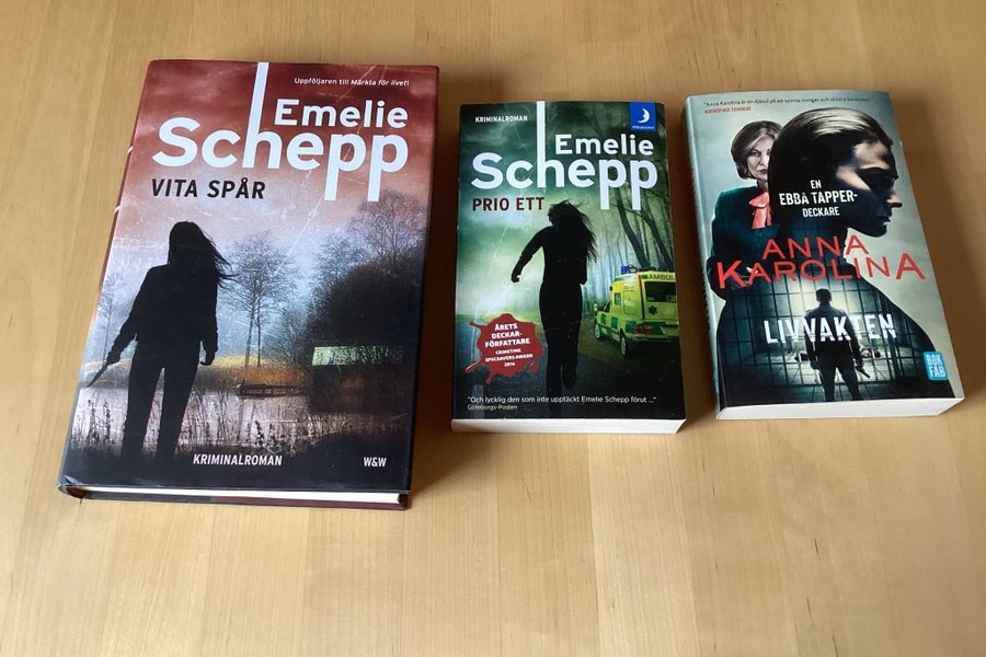 Kriminalromanen "Vita Spår" av Emelie Schepp, inbunden . Uppföljaren till "Märkta för livet!". Vidare en pocket i samma serie,Prio ett. Samt en pocket av Anna Karolina, Livvakten. Fint skick.