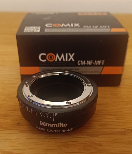 Med denna adapter i nyskick (knappt använt) fungerar Nikons objektiv med NF-fattning på Micro Four Thirds-kameror med M4/3-fattning (MFT).
