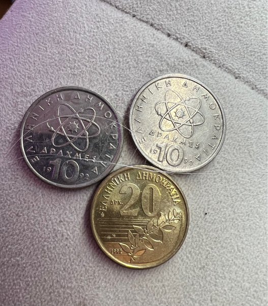 Tre grekiska mynt. Inkluderar 10 Drachmai från 1990, 10 Drachmai från 1992 och 20 Drachmai från 1992.