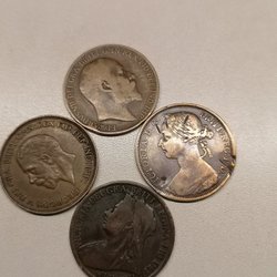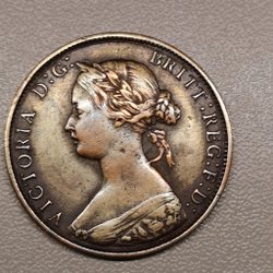 En brittisk Farthing från 1866. Myntet har texten 'VICTORIA D:G: BRITT:REG:F:D:' på ena sidan och 'FARTHING 1866' på andra sidan.