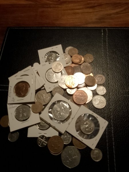 En samling av brittiska mynt ca 400 gram. Från 1907 och framåt ,några av dom i fodral är extremt fina. Lite gott o blandat.