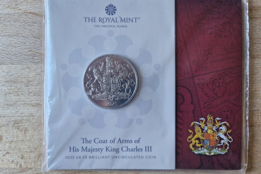 2025 UK £5 Brilliant uncirkuleret mønt med The Coat of Arms of His Majesty King Charles III.