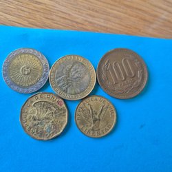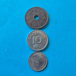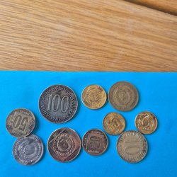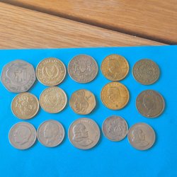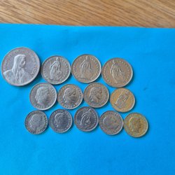Denna samling innehåller flera brittiska mynt. Ett mynt från 1929 med texten "ONE PENNY". Ett mynt från 1914 med texten "ONE PENNY". Ett mynt från 1948 med texten "SIX PENCE". Ett mynt från 2002 med texten "ELIZABETH II D G REG F D". Ett mynt med texten "GEORGE VI D G BR OMN REX". Ett mynt med texten "GEORGE V D G BRITT OMN REX FID DEF IND IMP". Ett mynt med texten "TEN PENCE".