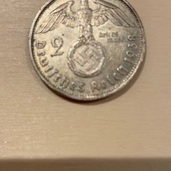 Ett tyskt samlarobjekt präglat 1938 med värdet 2 Reichsmark. På framsidan syns Paul von Hindenburg. Titta på bilderna för egen bedömning. Titta gärna på mina andra auktioner.