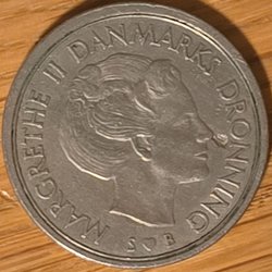 • Margrethe II: nutida mynt med Danmarks nuvarande drottning.