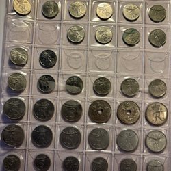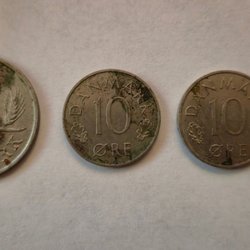 Några danska mynt. Inkluderar 5 Kroner, 1983 1 Krone, 25 Öre, 10 Öre 5 öre
