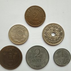 En samling av danska mynt i olika valörer och årtal. Inkluderar 1 kr, 5 kr, 10 öre, 25 öre, 2 öre och 5 öre. Årtal från tidigt 1900-tal till senare delen av 1900-talet.