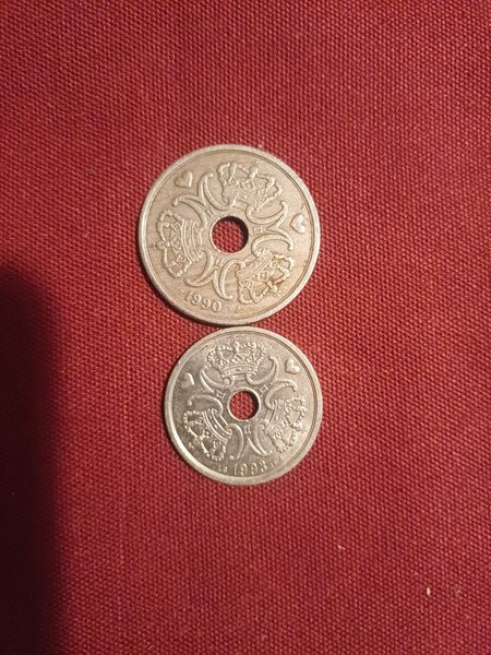 Två danska mynt. Ett mynt från 1990 och ett från 1993. Båda har ett hål i mitten.