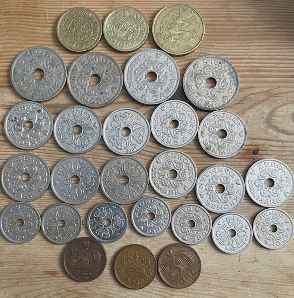 Samling av danska mynt i olika valörer. Inkluderar 50 Öre, 1 Krona, 2 Kronor, 5 Kronor, 10 Kronor och 20 Kronor. Årtal som 1989, 1993, 1994, 1997, 2003, 2007 och 2008 förekommer.