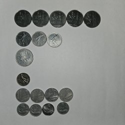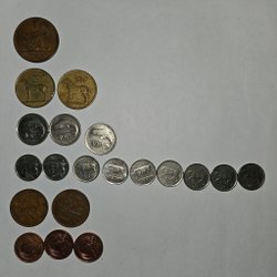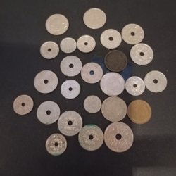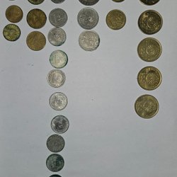 Samling av danska mynt i olika valörer. Inkluderar 2 Kroner, 1 Krone, 25 Öre, 10 Öre och 5 Öre.