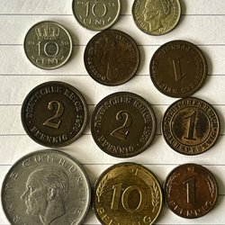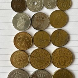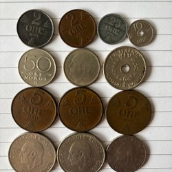 Parti med danska mynt. Innehåller 1 öre Danmark, 2 öre Danmark, 5 öre Danmark, 25 öre Danmark, 1 skilling riksmynt, 1 öre, 1/2 skilling riksmynt, 1 skilling riksmynt, 1 öre 1857, 1 öre 1945, 1 öre 1957, 1 öre 1969, 2 öre 1969.