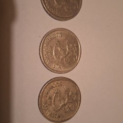 Parti med tre finska mynt. Ett mynt är från 1916 med värdet 1 penni. De andra två mynten är från 1866 och 1899, båda med värdet 5 pennia.