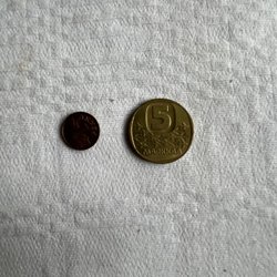 Sex finska mynt. Tre mynt är 10 penni från 1963, 1966 och 1977. Två mynt är 5 penni från 1963 och 1966. Ett mynt är 5 mark från 1970.