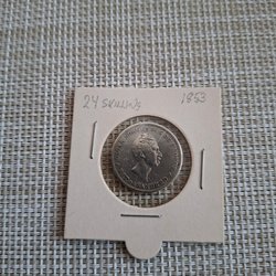 Detta är ett äldre mynt från 1854 med valören 18 Skilling. Myntet har ett vapen med ett krönt lejon.