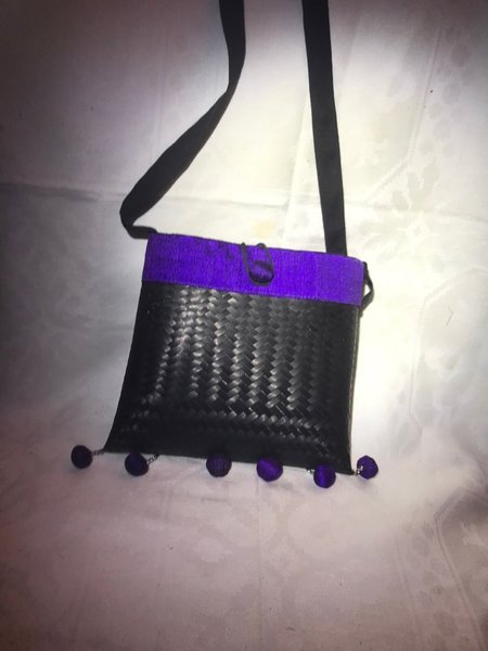 Flätat material. Lila detaljer. Stl ca 17x17cm ett fack med dragkedja inuti. Fint skick. Laos