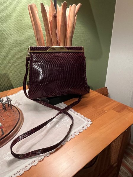 Elegant handväska, 20 cm bred, 17 cm hög med ett distinkt ormskinn och en axelrem. Väskan har en klassisk design med en guldfärgad metallspänne. Helt felfri inuti med liten innerficka.