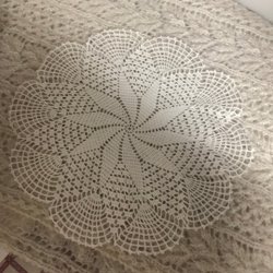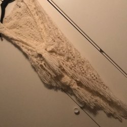 Blå stickad sjal med ett vackert spetsmönster. Sjalen hänger på en galge.