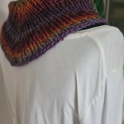 Ett handstickat set med en mössa och en halskrage i ett vackert flerfärgat garn. Mössan har en bekväm passform. Halskragen kompletterar mössan perfekt och kan bäras på olika sätt för att hålla värmen under kalla dagar. Den är 220 cm lång.