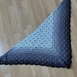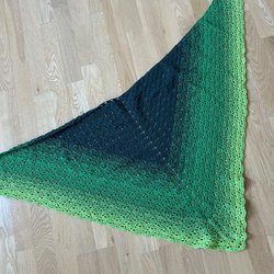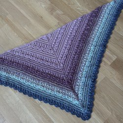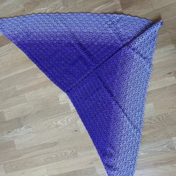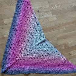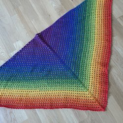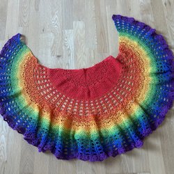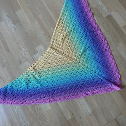 Här är en vacker, handvirkad sjal i regnbågens alla färger. Sjalen har en triangulär form och ett fint hålmönster. Den är ca 120 cm bred, 55 cm hög och 85 cm djup.