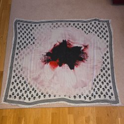 Vit sjal med bruna prickar. Sjalen har en lätt och luftig känsla.